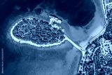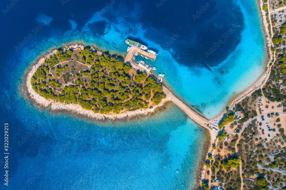 Aerial view of beutiful small island in sea bay at sunny day in summer in Murter, Croatia. Top view of transparent blue water, green trees, mountain, sandy beach, boats and yachts. Tropical landscape