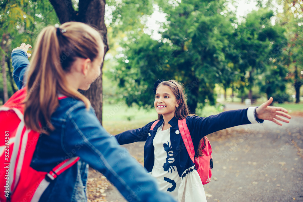 Two school friends hugging, meet in the park.