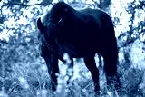 beautiful black quarter horse with long black mane and with western bridle by the sunset