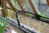 Hinged open wooden garden nursery window showing the ornate, Iron hinge system. Used to help with ventilation in a humid and warm plant greenhouse.