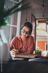 Young female administrative manager in eyeglasses making notes of information working at modern at office, People Business Lifestyle