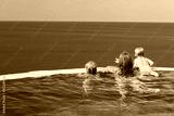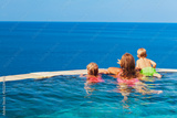 Happy children have fun on summer beach holiday. Young mother with kids relaxing at edge of infinity swimming pool. Sea view from hill top. Healthy family lifestyle, summer travel on tropical vacation