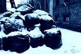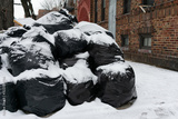 Trash Bags Covered with Snow on the Sidewalk in Astoria Queens New York