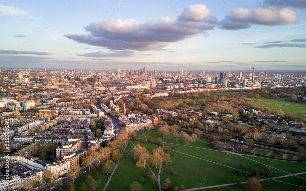 London skyline. Aerial drone photo from Primrose Hill in North London looking south with many key landmarks in view.