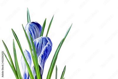 Large crocus Crocus sativus C. vernus flowers with purple streaks for postcards, greetings for Mother's Day, Valentine's Day. Isolated on white background