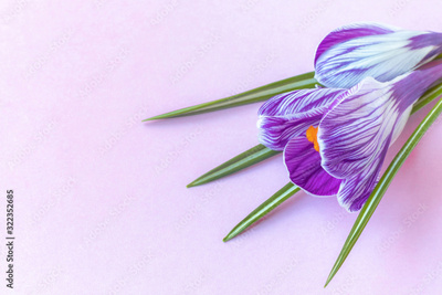 Purple crocus flower on a pink background for the design of holiday cards, mother's day, birthday, Valentine's Day. Copy space