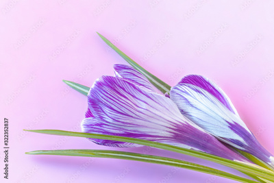 Purple crocus flower on a pink background for the design of holiday cards, mother's day, birthday, Valentine's Day. Copy space