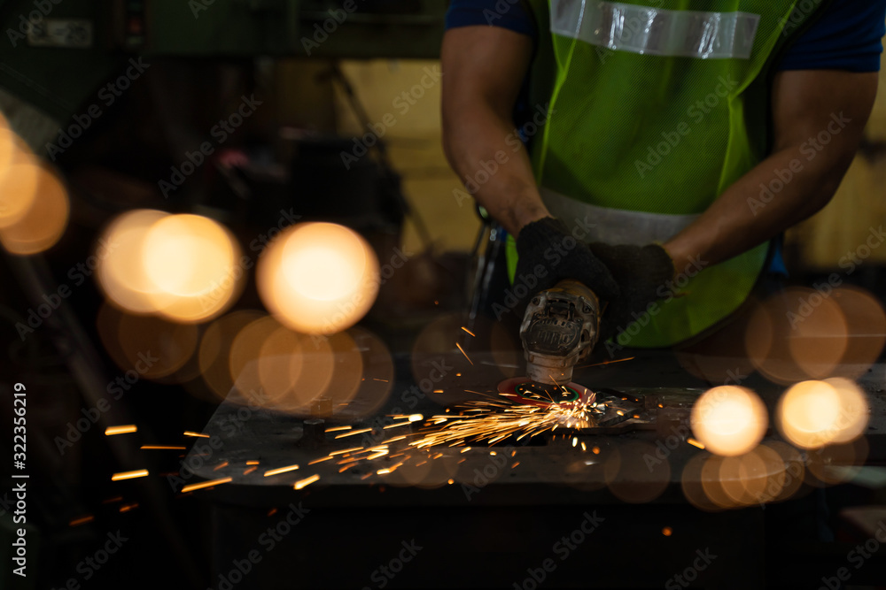 Work at the Heavy Industry Manufacturing Facility concept.Heavy industry worker cutting steel in workshop.bokeh light.