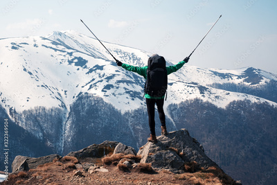 Amazing view with snowy mountains range and hiker with backpack on a foreground. Landscape photography