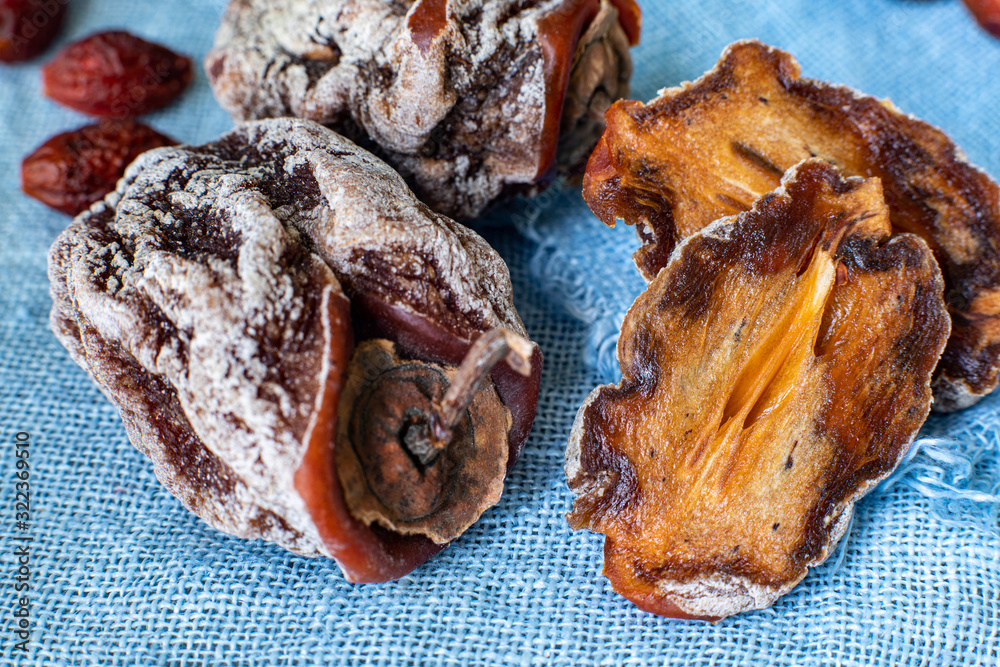 Whole fruits and slices of dried candied persimmons on a blue crumpled napkin. Close-up