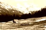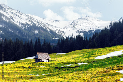 Old wooden hut in spring High Tatras mountains in Kalatowki meadow, Zakopane, Poland. Landscape photography