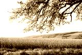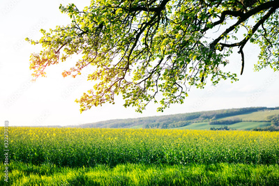 Sunny rural summer landscape with agricultural rape field and tree branches