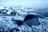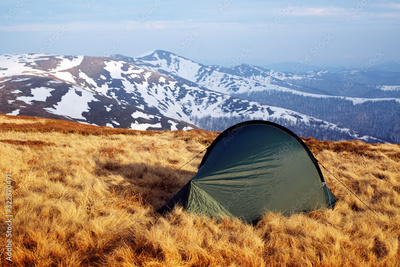 Green tent on amazing meadow in spring mountains. Landscape photography, travel concept