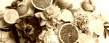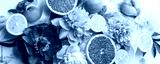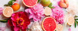 Abstract background with beautiful peonies flowers fruits, seasonal spring summer time concept, freshness, detox creative flat lay, stylish elegance composition, banner