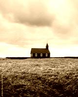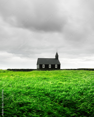 Gorgeous landscape with famous picturesque black church of Budir at Snaefellsnes peninsula region in Iceland and field of beauty green grass