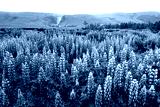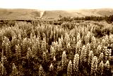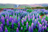 Incredible landscape with lupine flowers field and famous Skogafoss waterfall on background. Iceland, Europe
