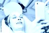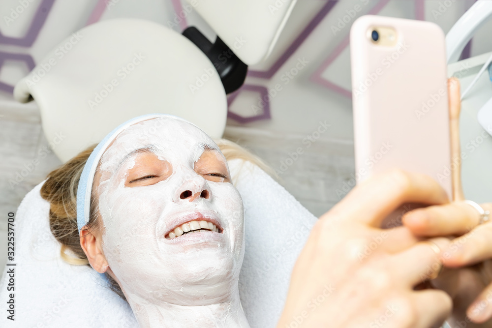 Young adult woman lying on bed at beauty spa salon with applied facial cosmetic mask making phone selfie shot for social networks. Influencer making online vlog stream with skin care product review