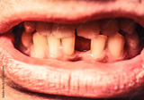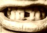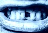 Bad teeth closeup. Man without one front tooth. Bad dental health, no teeth, no fluoride, tooth erosion. No teeth. Men with a lost front tooth, toothache. Yellow teeth