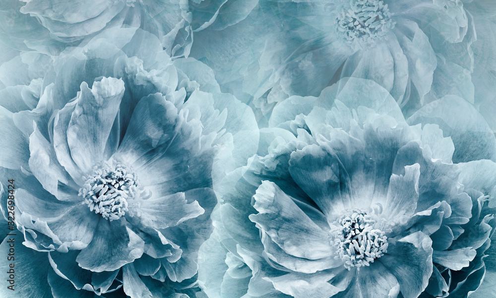Floral blue-white background. Flowers and peony petals. Flower composition. Place for text. Greeting card. Nature.