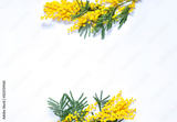 Floral spring frame with mimosas on the white background. Top view. Copy space