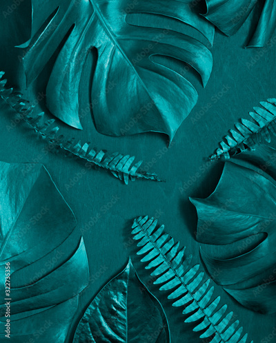 Tropical leaves summer concept frame on the wooden dark background. Top view