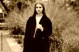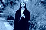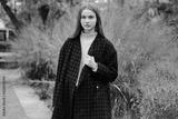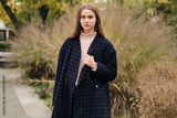 Beautiful girl in coat intently looking in camera outdoor
