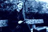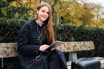 Pretty smiling girl with suitcase happily using tablet resting on bench in park