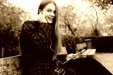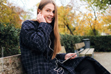 Pretty cheerful girl in earphones happily resting with tablet on bench in park