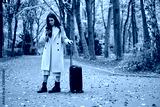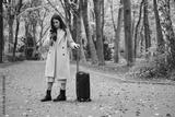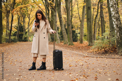 Attractive girl in coat intently using cellphone standing in autumn park with suitcase