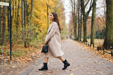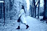 Side view of attractive brunette girl in coat walking around beautiful autumn park