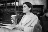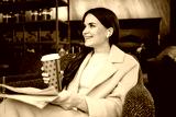 Pretty smiling businesswoman in wireless earphones happily drinking coffee in cafe