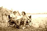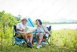 Happy asian senior couple Camping at the waterfront, sitting on a chair, view tourist map, with copy space.