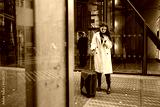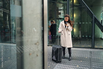 Young businesswoman in coat using cellphone waiting on street with suitcase