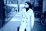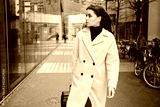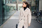 Young businesswoman in coat confidently walking around city street with suitcase