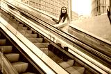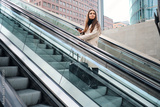 Young beautiful casual businesswoman with suitcase on escalator outdoor