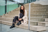 Attractive brunette girl thoughtfully looking in camera resting on stairs