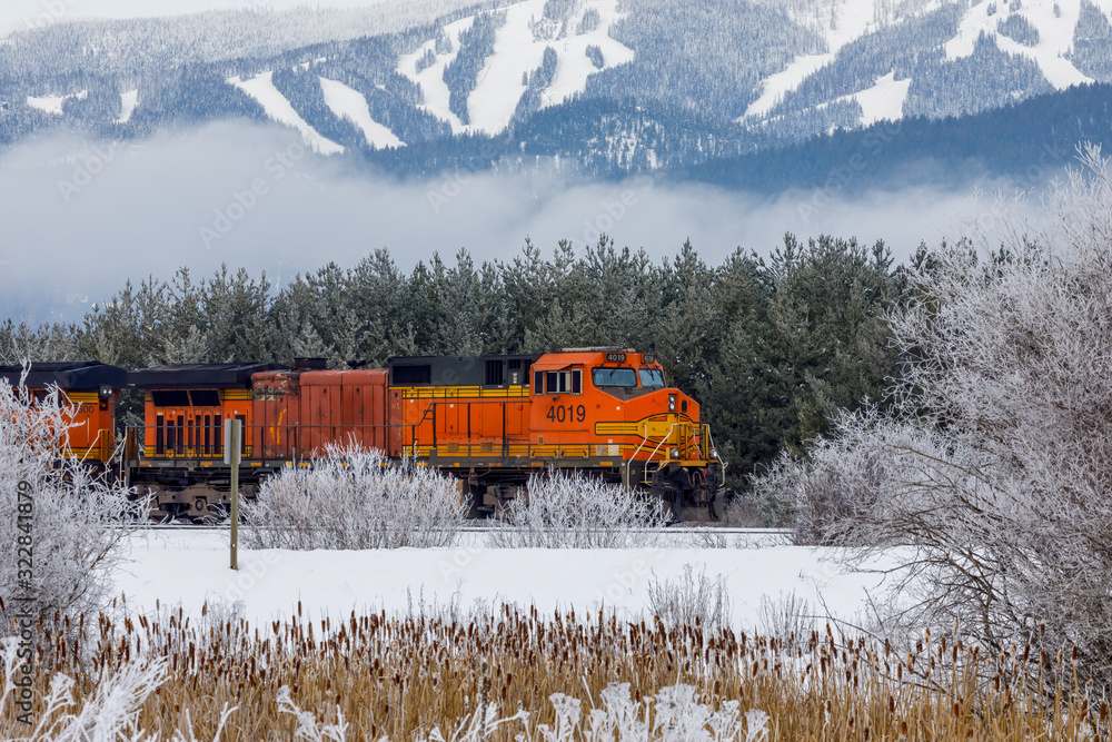 locomotive pulling train in winter close to Whitefish, Montana with big mountain ski resort in background
