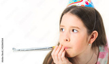 Celebrating brightful carnival for kids, birthday party. Isolated on white. Portrait of little girl. Child's birthday party. Little girl happy celebrate. Teenager or preteen, carnival