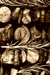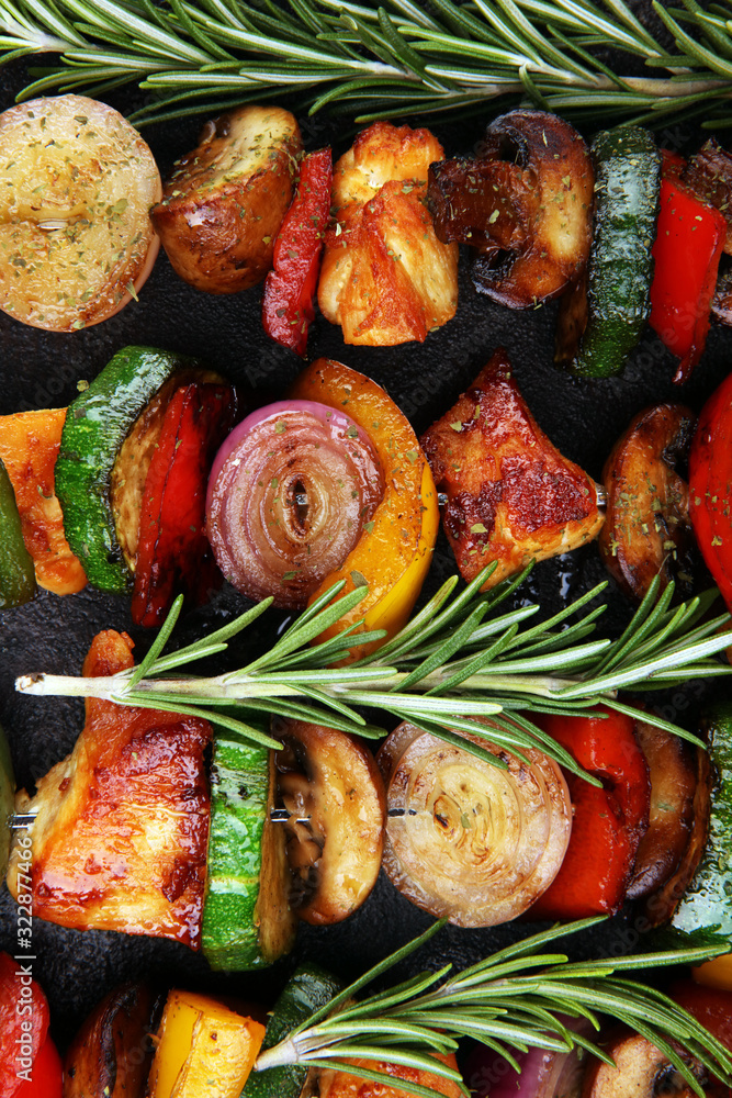 Grilled pork shish or kebab on skewers with vegetables . Food background shashlik