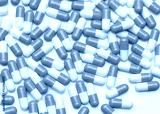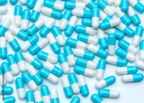 Blue-white capsule pills on white table. Full frame of capsule drug pills. Pharmacy product. Pharmaceutical production concept. Pharmaceutics. Medicine use in hospitals and pharmacies. Healthcare.