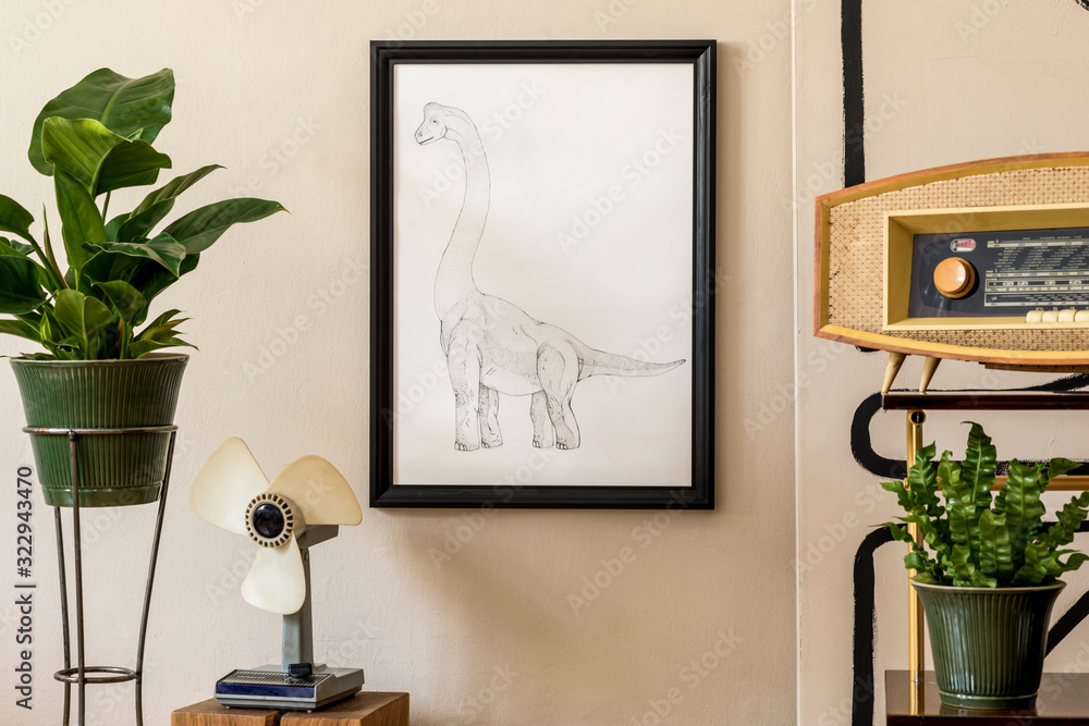 Stylish composition of retro living room interior filled with a lot of plants in green pots, black mock up poster frame, retro radio and fan. Vintage home decor. Minimalistic concept. Template.