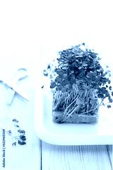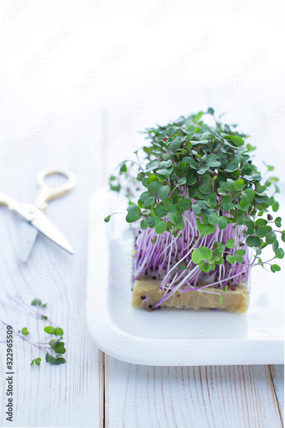 Young sprouts of organic kohlrabi cabbage close up. Micro greens concept