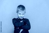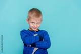 The little boy on a blue background was offended by folding her arms and frowning eyebrows