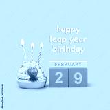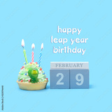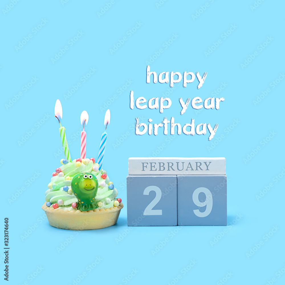 Happy Leap year Birthday greeting concept. February 29 date calendar, Frog and Birthday cupcakes on blue background. Leap day leap year