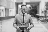 Attractive smiling caucasian elegant businessman in suit and with eyeglasses standing outdoors, holding tablet and looking at camera.