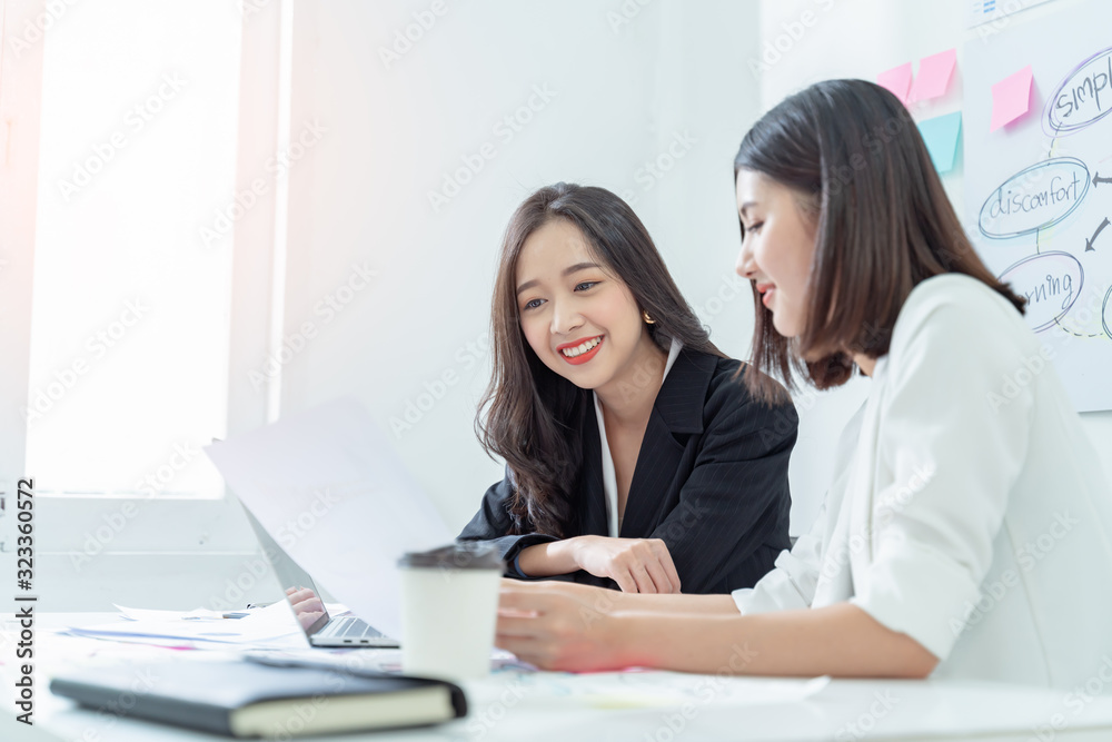Successful and Team work process concept.Two women with laptop in open space office. Sun glare and Film effect effect.copy space.