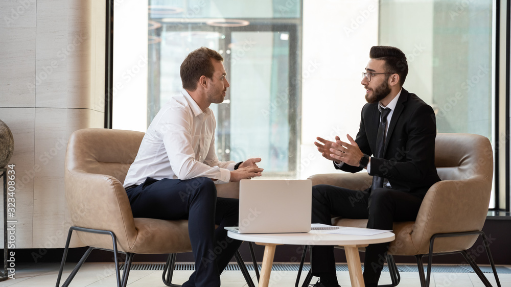 Middle eastern and caucasian ethnicity businessmen talking negotiating indoors