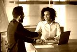 African and arab businesspeople seated at desk in boardroom handshaking