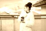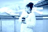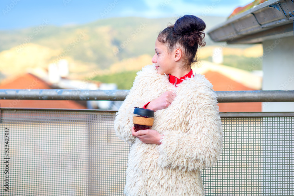 Young girl wearing stylish coat feeling cold outdoor in the city. Lifestyle portrait of teenage girl walking on the rooftop, looking at the beautiful landscape and drinking coffee from reusable cup.