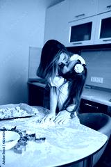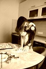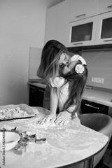 nice cute little girl kissing her mother, hugging her in the kitchen while preparing cake, close up photo, relationship, love, warm feeling and emotion